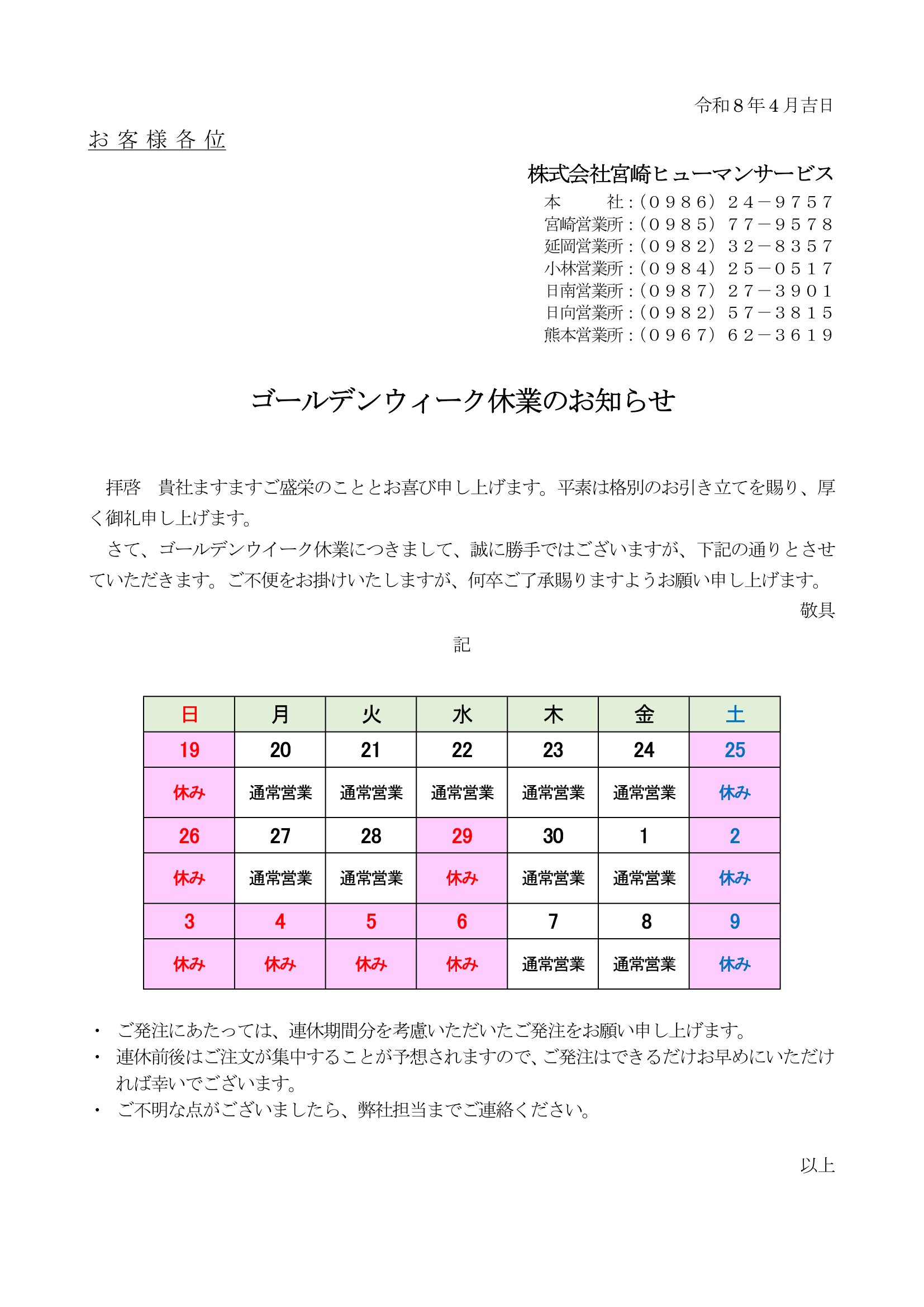 ゴールデンウィーク休業のお知らせ🎌
